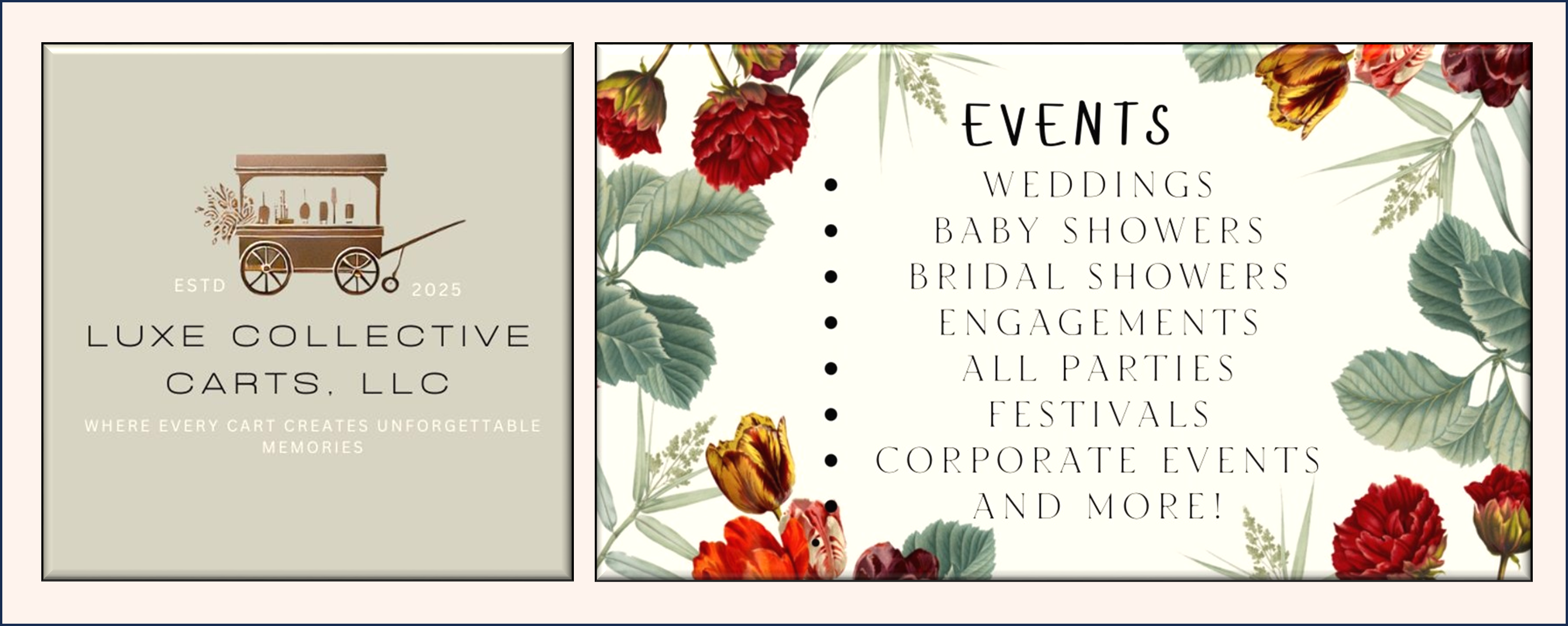 At Luxe Collective Carts, we believe every celebration deserves a special touch. Whether you’re planning a whimsical kids’ birthday party, an elegant wedding, a lively retirement bash, or a stylish corporate event, we’re here to bring your vision to life — one cart at a time. Our customizable carts are designed to elevate any event. Choose from our beautifully curated options like the Flower Cart, Mobile Bar Cart, Champagne Cart, Charcuterie Cart, Shot Cart, or let us design a Custom Cart made just for your occasion. From baby showers to bridal showers, engagement parties to milestone birthdays, we’ve got the perfect cart to match your style and theme. We bring creativity, charm, and a touch of magic to your event, ensuring your guests have an unforgettable experience. Let’s make your next celebration one to remember!